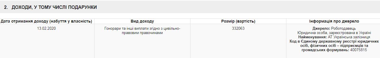 Согласно им, 13 февраля Лещенко получил гонорар в размере 332,063 тыс. гривен. Источником средств является работодатель в лице "Укрзализныци".