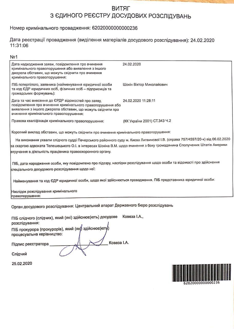 Об этом свидетельствует извлечение из Единого реестра досудебных расследований, опубликованное Telegram-каналом "UN - сливы и груши".