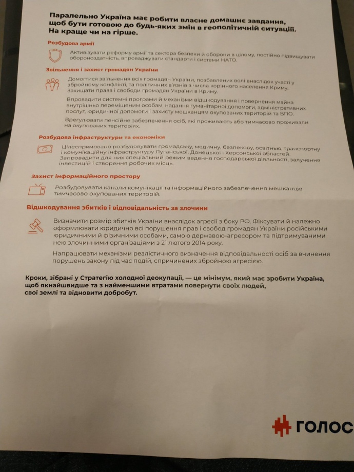 Это следует из трансляция партии "Голос" с презентации и краткий план "Голос разума: стратегия холодной деоккупации оккупированных районов Донбасса и Крыма".
