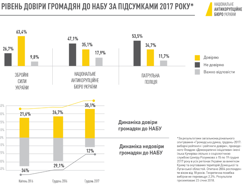 То есть, по данным самого НАБУ, в апреле 2016 года (через полгода от начала работы ведомства) бюро доверяли почти 22% украинцев и уже через полтора года этот показатель дорос до 35%.