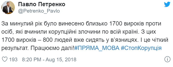 Впрочем, цифры Луценко можно корректировать и в сторону увеличения: на 1 декабря 2017 года он вряд ли владел статистикой за весь год. Ее позже опубликовал глава Минюста Павел Петренко: по его данным, за коррупцию только в 2017 году сели в тюрьму 800 человек.