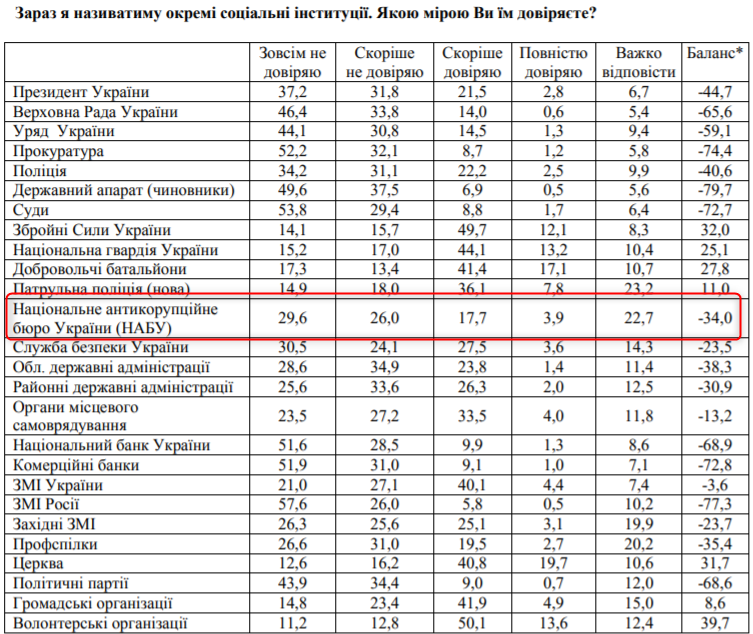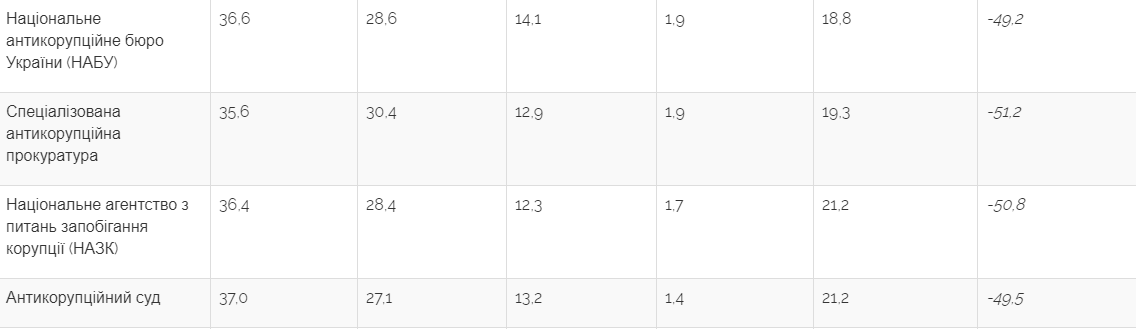 По уровню недоверия с антикоррупционерами может соперничать только правительство, прокуратура и суды. При этому у других силовых ведомств - полиции, СБУ, Нацгвардии - рейтинги сейчас существенно выше.