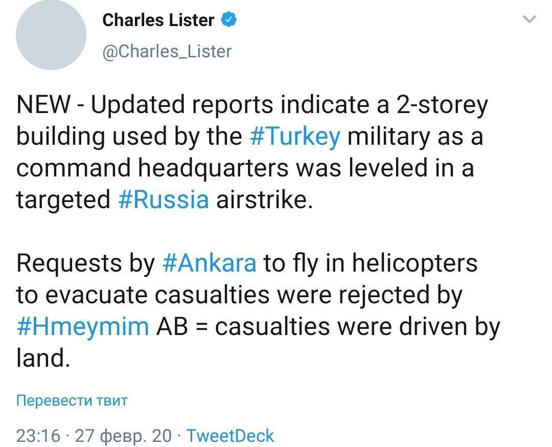 Командование авиабазы Хмеймим, по его словам, сегодня запретило туркам использовать воздушное пространство Идлиба, раненых приходится эвакуировать по земле.
