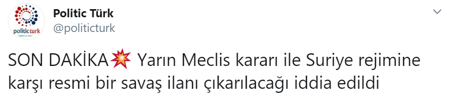 "Официальное объявление войны режиму Сирии будет опубликовано решением парламента завтра", - говорится в сообщении местного издания Politic Türk поздним вечером в четверг, 27 февраля.