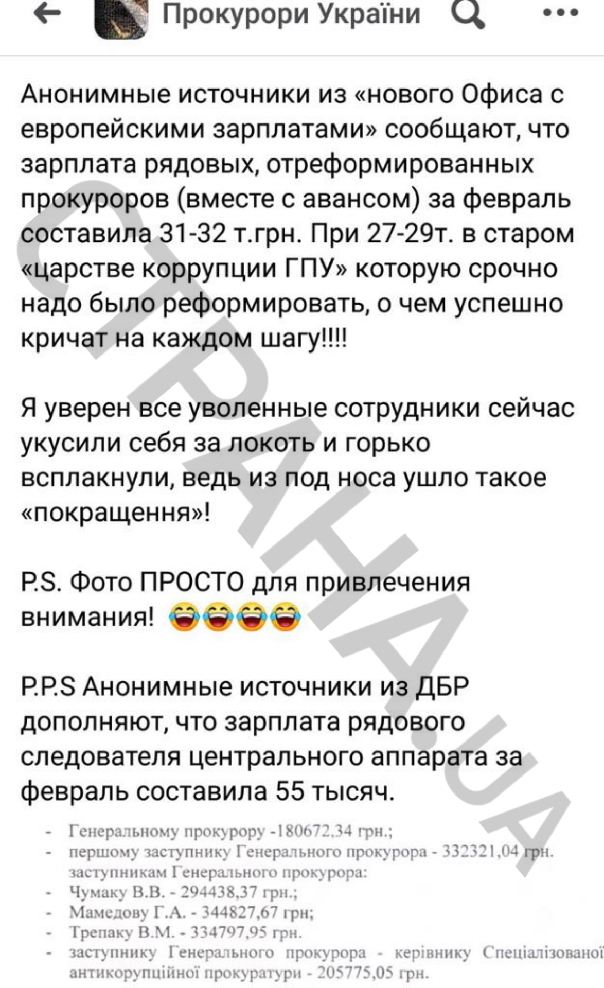 Как мы узнали из собственных источников на Резницкой, вместо обещанного существенного повышения зарплаты до 60-70 тысяч гривен, рядовым прокурорам отделов Офиса генерального заплатили меньше, чем они получали до реформы, которая заставила проходить их трехуровневое изнурительное тестирование и собеседование с полной проверкой деклараций за все годы.