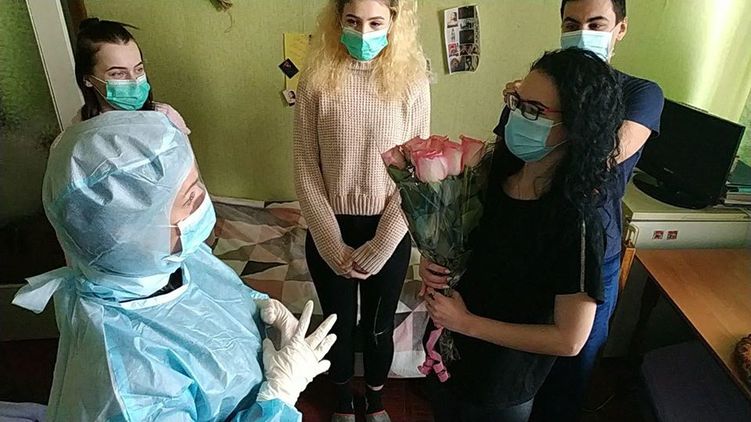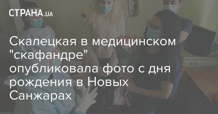 На фото рядом с именинницей в масках находятся другие эвакуированные, а также сотрудница (возможно, Скалецкая) в настоящем медицинском "скафандре".