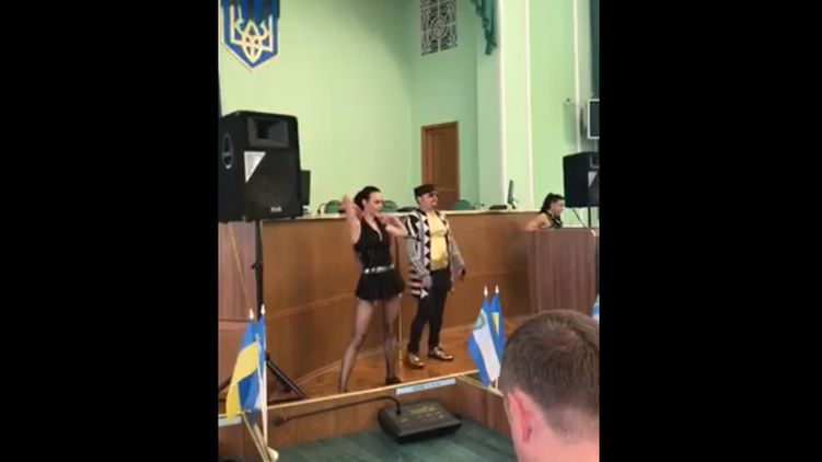 В Херсонской ОГА на 8 марта танцевали девушки в откровенных нарядах. Скриншот: Facebook/ Maryna Khromykh