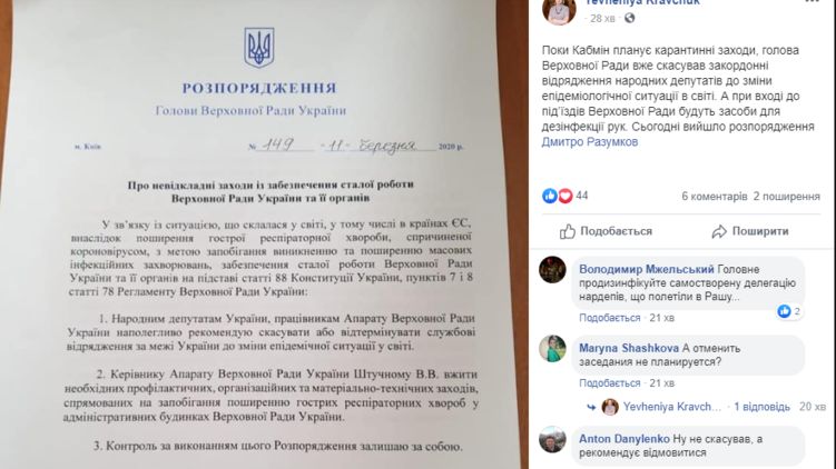 "Пока Кабмин планирует карантинные мероприятия, глава Верховной Рады уже отменил зарубежные командировки народных депутатов до изменения эпидемиологической ситуации в мире. А при входе в подъезды Верховной рРады будут средства для дезинфекции рук. Сегодня вышло распоряжение Дмитрия Разумкова", - написала Евгения Кравчук.