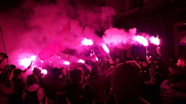 После этого митингующие зажгли файеры и принялись скандировать: "Ермак х@йло".
