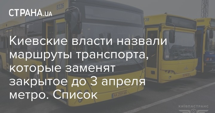 Киевский метрополитен приостанавливает перевозки пассажиров с 23:00 17 марта ориентировочно до 3 апреля. В связи с этим коммунальное предприятие "Киевпастранс" назвало маршруты наземного пассажирского транспорта, дублирующие ветки метро.