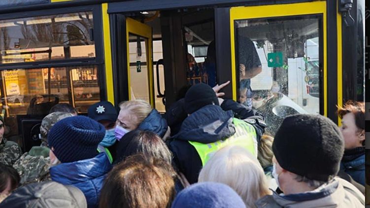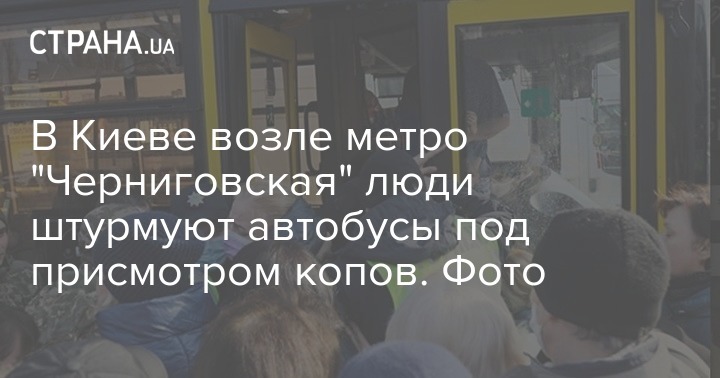 В Киеве возле метро "Черниговская" люди штурмуют автобусы под присмотром копов. Фото