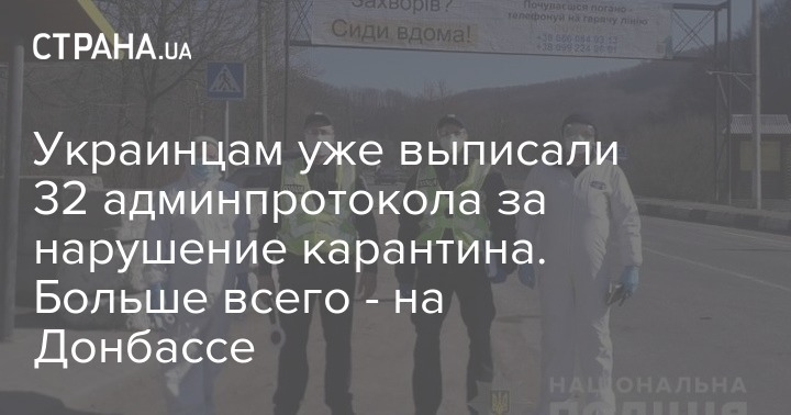 32 админпротокола в отношении нарушителей карантина составили украинские правоохранители за прошедшие сутки. В Украине начали работу контрольно-проверочные пункты. В частности, полицейские контролируют выполнение перевозчиками и субъектами хозяйствования ограничений, установленных Кабмином на период карантина из-за коронавируса.