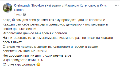 "Каждый сам для себя решает как ему проводить дни на карантине. Каждый сам себе режиссёр и сценарист, декоратор и постановщик в своем фильме жизни! Используйте данное вам время с пользой. Начните делать то, о чем задумывались много раз, но никак не хватало время начать... Станьте же наконец главным исполнителем и героем в вашем собственном Фильме Жизни! Нет хороших причин для плохих результатов! И да прибудет с вами 36,6. Это не курс доллара", - поделился с читателями Александр Шовковский.