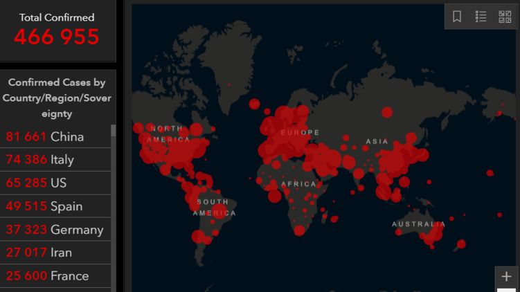 Статистика заражений и карта распространения вируса к 26 марта. Фото: https://coronavirus.jhu.edu