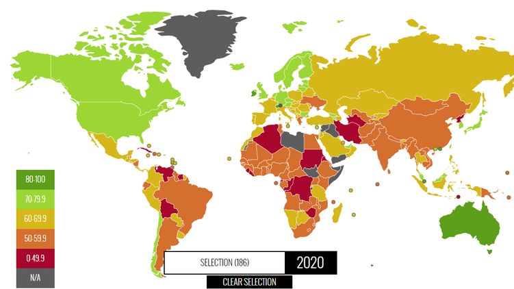 Согласно данным рейтинга, Украина входит в категорию "преимущественно несвободных" стран и занимает последнее, 45-е место в Европе. Общий балл Украины - 54,9 - значительно ниже средних региональных и мировых показателей. В общем рейтинге наша страна занимает место между африканской страной Бенин (133 место) и Пакистаном (135 место).