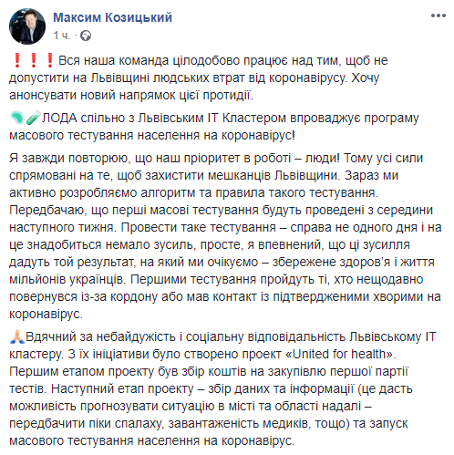 "Благодарен за неравнодушие и социальную ответственность Львовскому IT-кластеру. По их инициативе был создан проект United for health. Первым этапом проекта был сбор средств на закупку первой партии тестов. Следующий этап проекта - сбор данных и информации (это даст возможность прогнозировать ситуацию в городе и области в дальнейшем - предсказать пики вспышки, загруженность медиков и т.д.) и запуск массового тестирования населения на коронавирус", - говорится в сообщении.