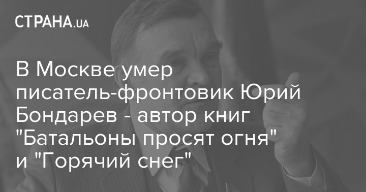 В Москве умер писатель-фронтовик Юрий Бондарев. Смерть произошла в воскресенье, 29 марта. Писатель ушел из жизни в возрасте 96 летю