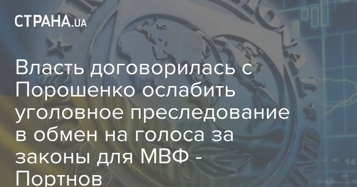 "Взамен голосов фракции главного государственного и военного преступника ему обещают послабление уголовного преследования и координацию с ним юридических действий по постепенному выводу из уголовных производств. Если совсем простым языком - торгуют с преступником за деньги МВФ", - объяснил Портнов, по заявлениям которого было открыто большинство уголовных производств против Порошенко.