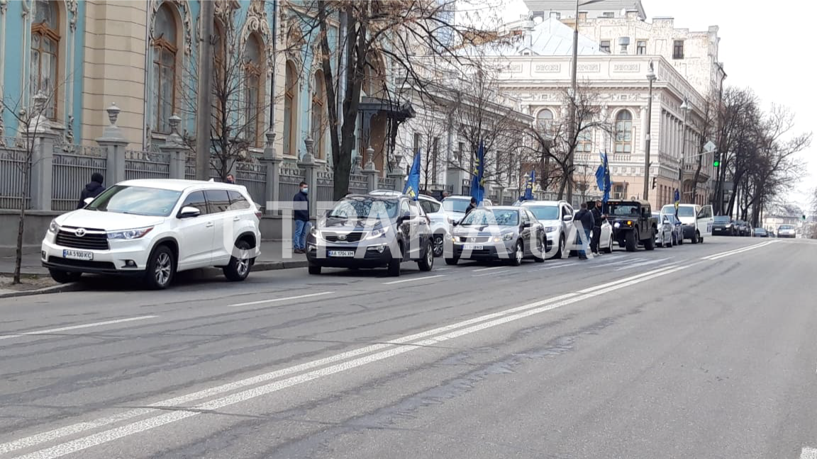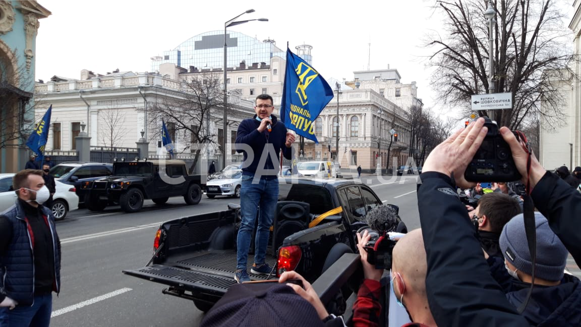 Под Верховную Раду 30 марта, когда нардепы проводят внеочередное заседание, приехали с протестом представители Национального Корпуса на девяти автомобилях в сопровождении полиции.