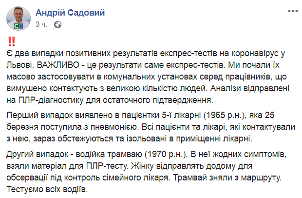 "Есть два случая положительных результатов экспресс-тестов на коронавирус во Львове. ВАЖНО - это результаты именно экспресс-тестов. Анализы отправлены на ПЦР-диагностику для окончательного подтверждения", - говорится в сообщении.