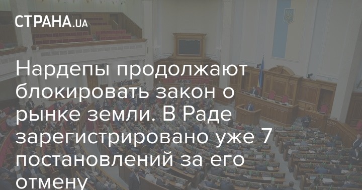 Депутаты продолжают блокировать подписание спикером Разумковым и президентом Зеленским закона о рынке земли. В Верховную Раду подано уже 7 проектов постановления об отмене закона, из которых 2 парламент зарегистрировал сегодня.