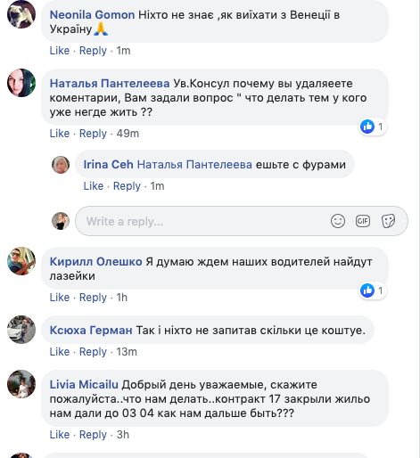 "Как можно и когда можно и кто может помочь с выездом в Украину из Италии? Прошу предоставить такую консультацию. Нас тут много таких, которые ждут каких-то действий или элементарной поддержки", - написала Питыляк в Facebook 29 марта, уже после анонсированного закрытия границы.