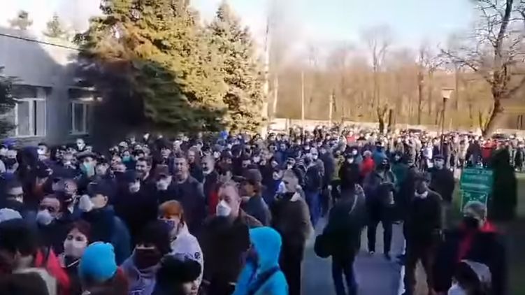 В Кривом Роге тысячи металлургов стоят в очереди за спецпропуском для проезда в общественном транспорте. Скриншот из видео