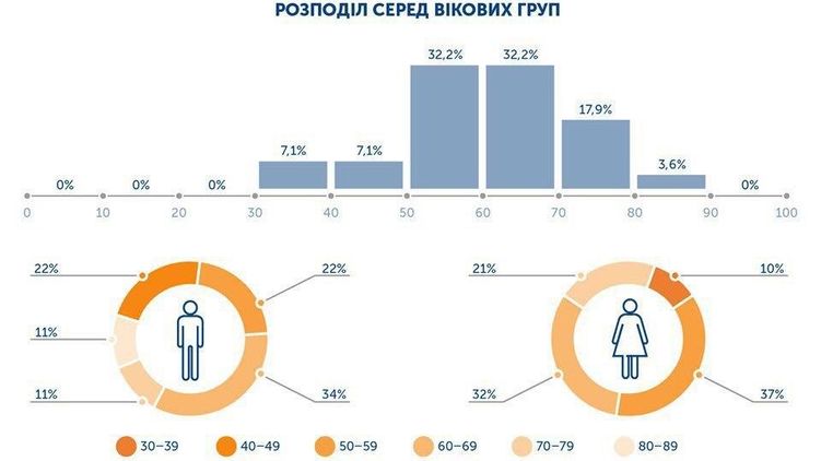 Большинство смертей от коронавируса в Украине приходится на пациентов возрастом от 50 до 70 лет.