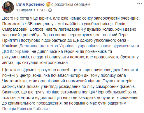 "Прекратите наконец-то врать! Что вы якобы контролируете ситуацию. О каком "горении травяного настила, камыша и лесной подстилки отдельными очагами" вы твердите?! Сейчас ситуация неконтролируемая - она критична. От всего сердца спасибо пожарным и спасателям! Спасибо так же, как в 1986 году!" — написала Дегтяренко в Facebook.