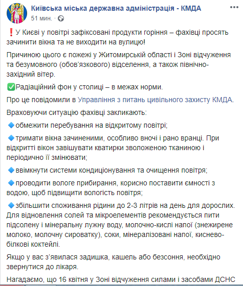 Пресс-служба КГГА вечером сообщила, что запах гари связан с пожарами в Чернобыльской зоне и Житомирской области, а также северо-западным ветром.