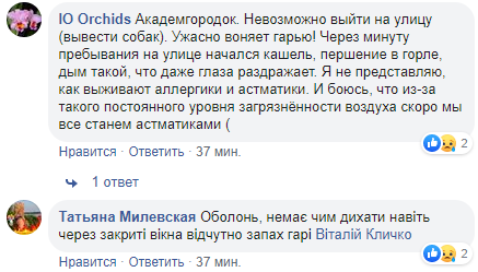 На Академгородке, Оболони люди жалуются, что на улице начинает першить в горле и начинается кашель.