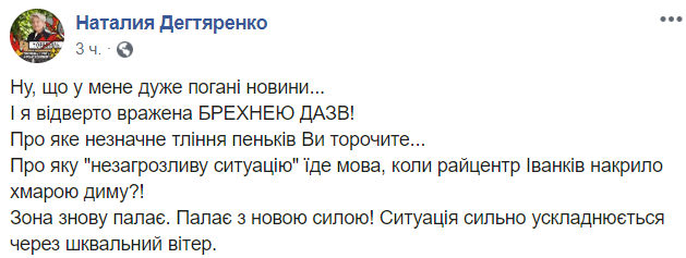 О каком "незначительном тлении пеньков" вы твердите? О какой "не несущей угроз ситуации" идет речь, когда райцентр Иванков накрыло облаком дыма?!
