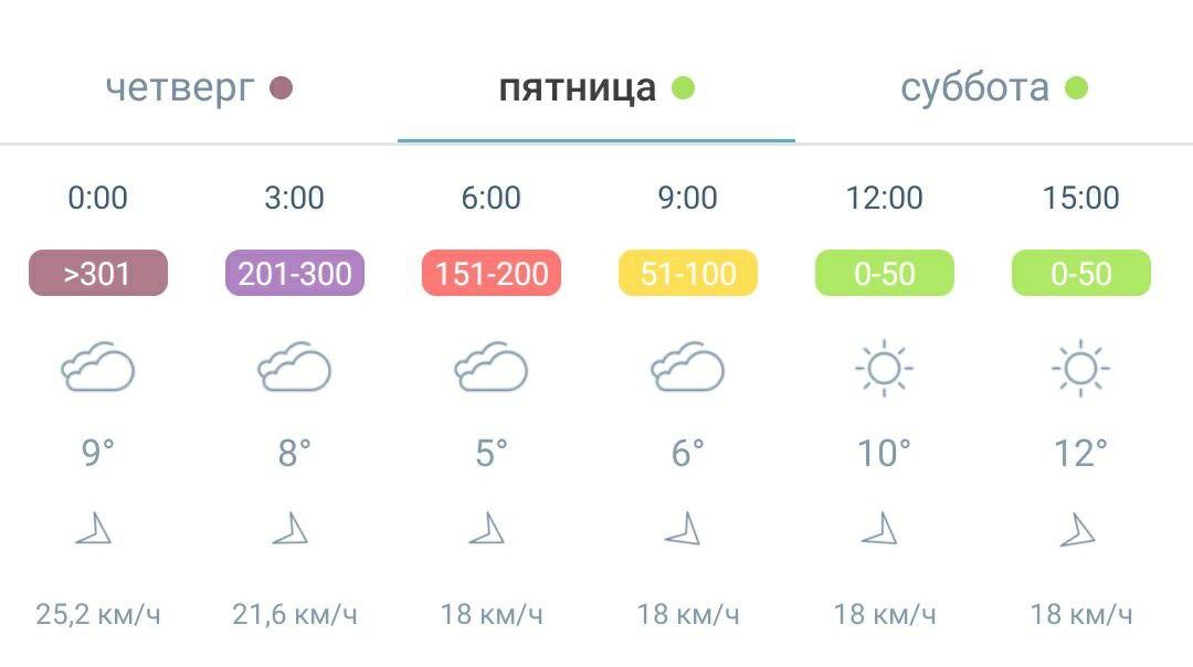 По прогнозу, воздух начнет очищаться ночью и утром выйдет к "желтым", а днем - к "зеленым" значениям. Что связано скорее всего с прогнозом ветра, который должен утихнуть.