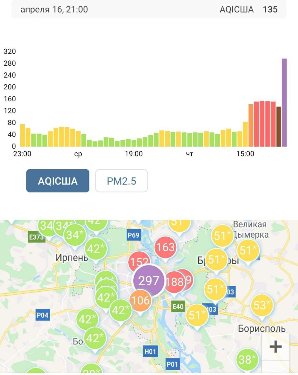 Непосредственной причиной загрязнения стали лесные пожары, которые продолжают бушевать вокруг Киева.
