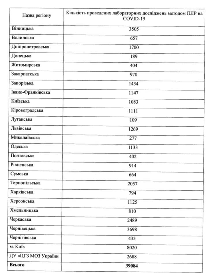 В ответе Минздрава на депутатский запрос Стефанишин было указано количество проведенных ПЦР-тестов. В МОЗ не указали время, за которое был проведено такое количество тестов, но из таблицы видно, что ситуация в разных регионах с тестированием существенно отличается и прослеживается корреляция - в областях, где меньше всего выявляют случаев Covid-19, и тестов делают меньше.