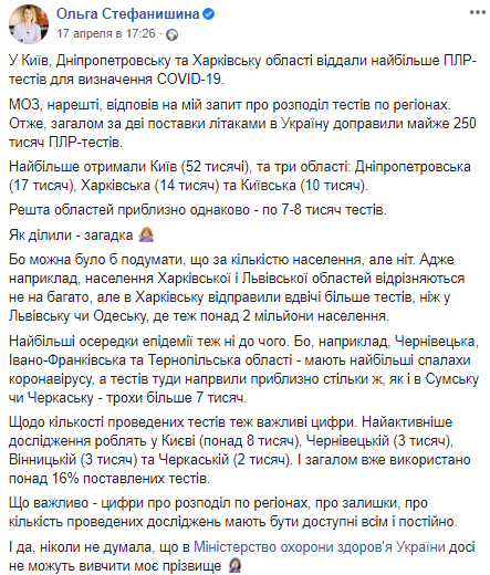 Всего в Украине, судя по этой справке, 250 тысяч лабораторных тестов. По данным Стефанишин, на 17 апреля было использовано более 16% поставленных тестов.