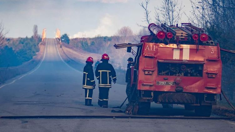 Инженерная техника ГСЧС окапывает территорию, чтобы не дать огню разойтись по сухой траве, а техника Вооруженных Сил Украины прокладывает путь пожарным по лесу. Продолжаются работы по созданию минерализованных полос инженерной техникой.