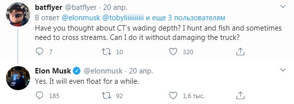 Один из подписчиков спросил у Маска, можно ли будет на Tesla Cybertruck пересекать ручьи без опаски повредить машину. В ответ глава американского автопроизводителя заявил, что пикап сможет плавать "некоторое время".