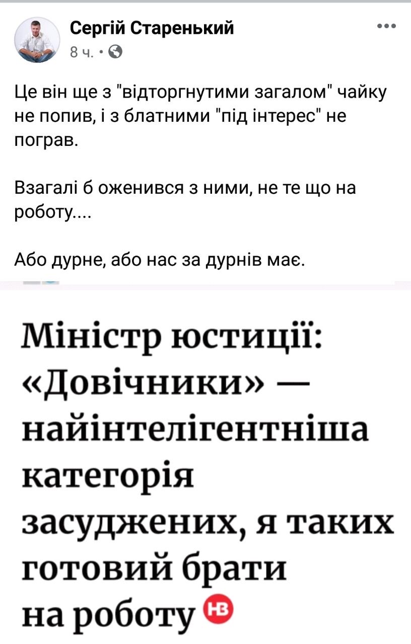 К примеру бывший глава Госпенитенциарной службы Сергей Старенький в своем Facebook так отреагировал на комплименты Малюськи в адрес "пожизненников":