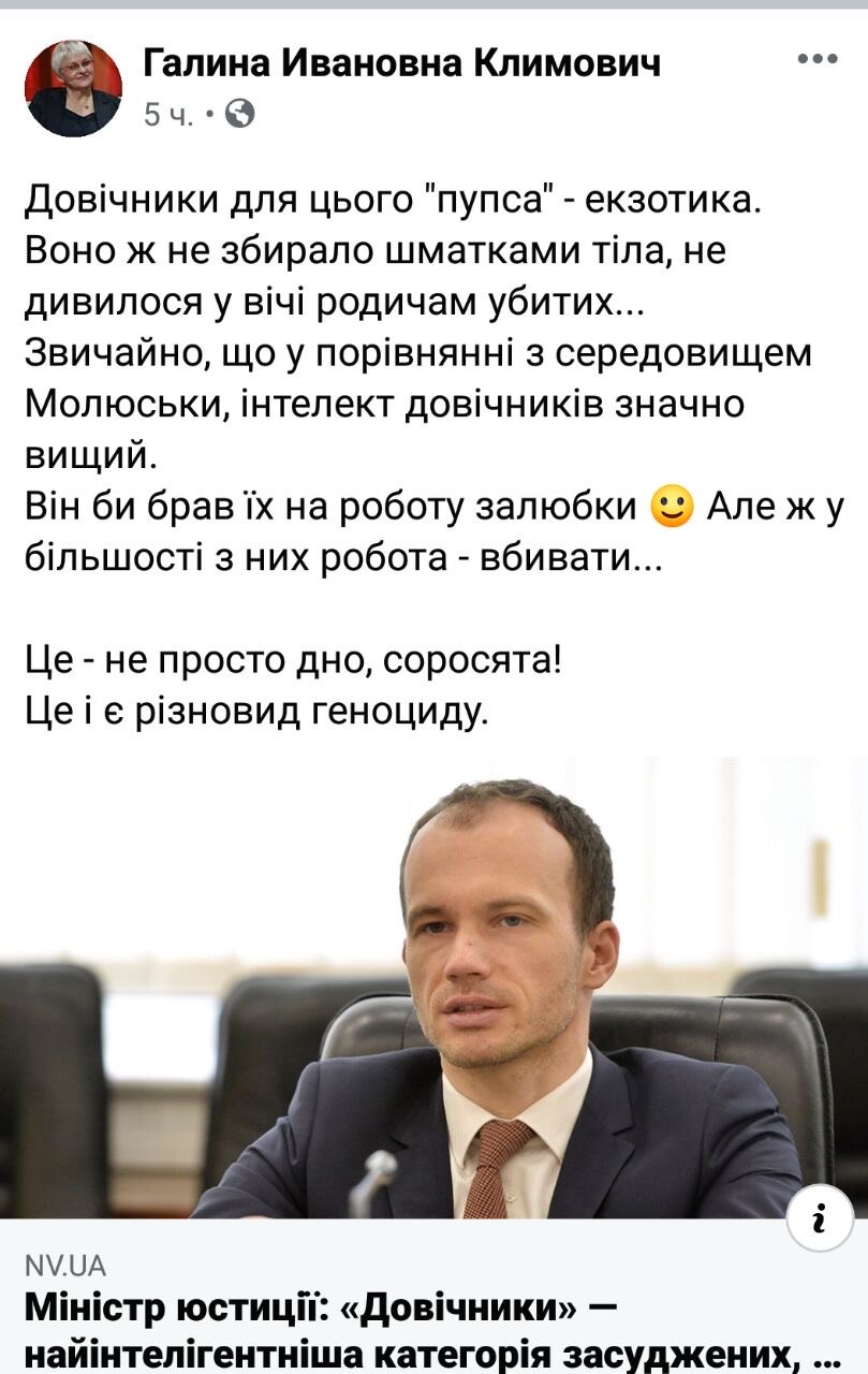 "Довічники для цього "пупса" - екзотика. Воно ж не збирало шматками тіла, не дивилося у вічі родичам убитих... Звичайно, що у порівнянні з середовищем Молюськи, інтелект довічників значно вищий. Він би брав їх на роботу залюбки. Але ж у більшості з них робота - вбивати... Це - не просто дно, соросята! Це і є різновид геноциду", - написала Климович в своем Facebook.
