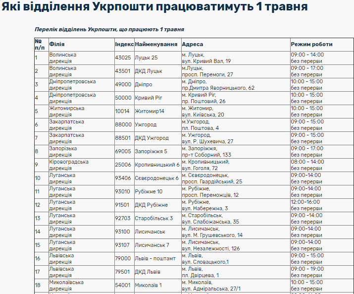 В "Укрпочте" пока сообщили, как будут работать 1 мая. Большинство отделений будут закрыты, но в регионах будут обслуживать посетителей дежурные филиалы: