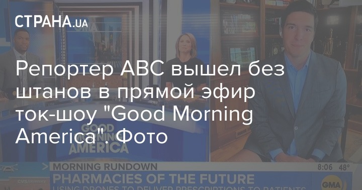Миллионы американцев стали свидетелями конфузной ситуации, в которую угодил журналист телеканала ABC Уилл Рив. В прямом эфире популярного утреннего шоу "Good Morning America" журналист появился без штанов. И как только это разглядели пользователи соцсетей, тут же начали забрасывать его советами надеть брюки.