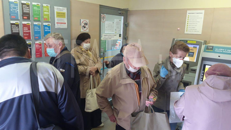 В отделениях "Ощадбанка" 30 апреля выстраиваются длинные очереди из пенсионеров, которые хотят получить пенсии и оплатить за коммунальные услуги. Народу много, пожилые люди, как и до Пасхи, не придерживаются необходимой дистанции в условиях карантина по коронавирусу.