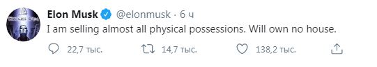 В этот вечер Маск опубликовал еще несколько твитов неоднозначного содержания. Он написал что продает все имущество и у него не будет собственного дома, потребовал вернуть людям свободу и рассказал, что его девушка, певица Grimes, злится на него.