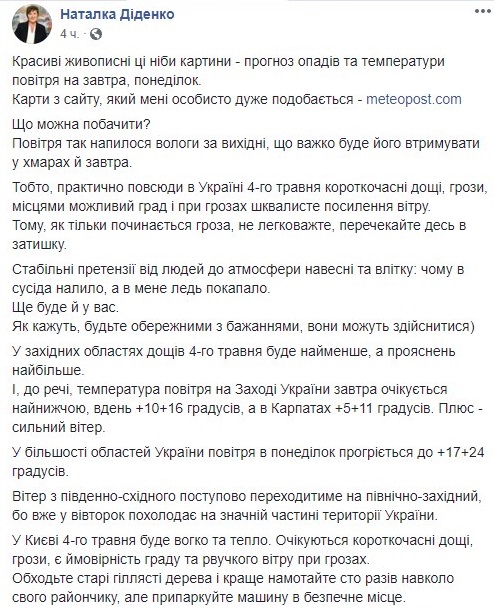 "Воздух так напился влаги за выходные, трудно будет его удерживать в облаках и завтра. То есть, практически повсеместно в Украине 4 мая будут кратковременные дожди, грозы, местами град и при грозах шквалистое усиление ветра", - написала она.