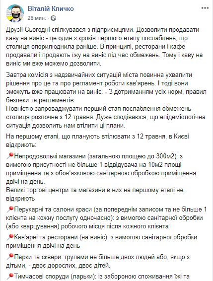 Также Кличко уточнил, какие предприятия заработают в столице с 12 мая.