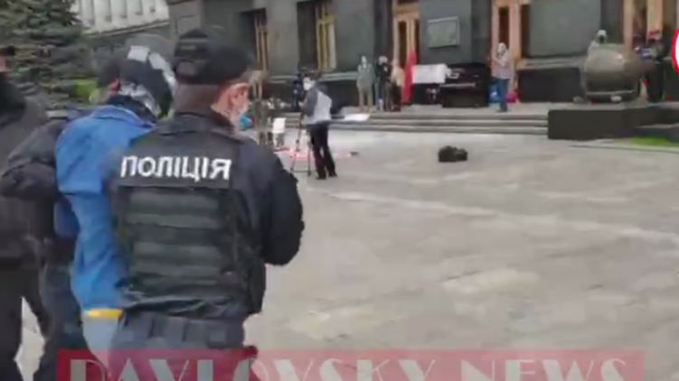 По словам очевидца, они провели перформанс, чтобы напомнить президенту, что может произойти, если он продолжит сдавать национальные интересы. Как утверждает участник, задержанный является ветераном АТО. Полиция задержала его и ждет пожарную службу для оформления протокола.