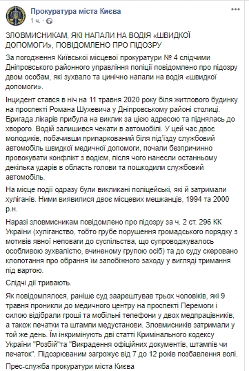 "Инцидент произошел в ночь на 11 мая 2020 возле жилого дома на проспекте Романа Шухевича в Днепровском районе столицы. Бригада врачей прибыла на вызов по этому адресу и поднялась к больному. Водитель остался ждать в автомобиле. В это время двое парней, увидев припаркованный у подъезда служебный автомобиль скорой медицинской помощи, начали беспричинно провоцировать конфликт с водителем, после чего нанесли последнему несколько ударов в область головы и повредили служебный автомобиль", - говорится в сообщении.