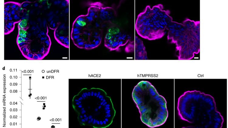 Энтероиды заразили вирусами из мазков носоглотки и мокроты трех пациентов с Covid-19 . Его размножение в клетках оценивали по количеству вирусной РНК и иммунофлуоресцентному окрашиванию белка нуклеокапсида. Кроме того, ученые проверили, содержат ли клетки кишечника два белка, необходимых SARS-CoV-2 для входа в клетку: ангиотензинпревращающий фермент 2, АПФ2, и сериновую протеазу TMPRSS2.