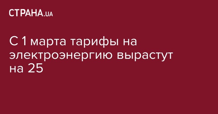 В Украине с 1 марта тарифы на электроэнергию в среднем вырастут на 25%. Повышение тарифов предусмотрено постановлением № 220 "Об установлении тарифов на электроэнергию, отпускаемую населению" от 26 февраля 2015 года Национальной комиссии по государственному регулированию в сферах энергетики и коммунальных услуг.